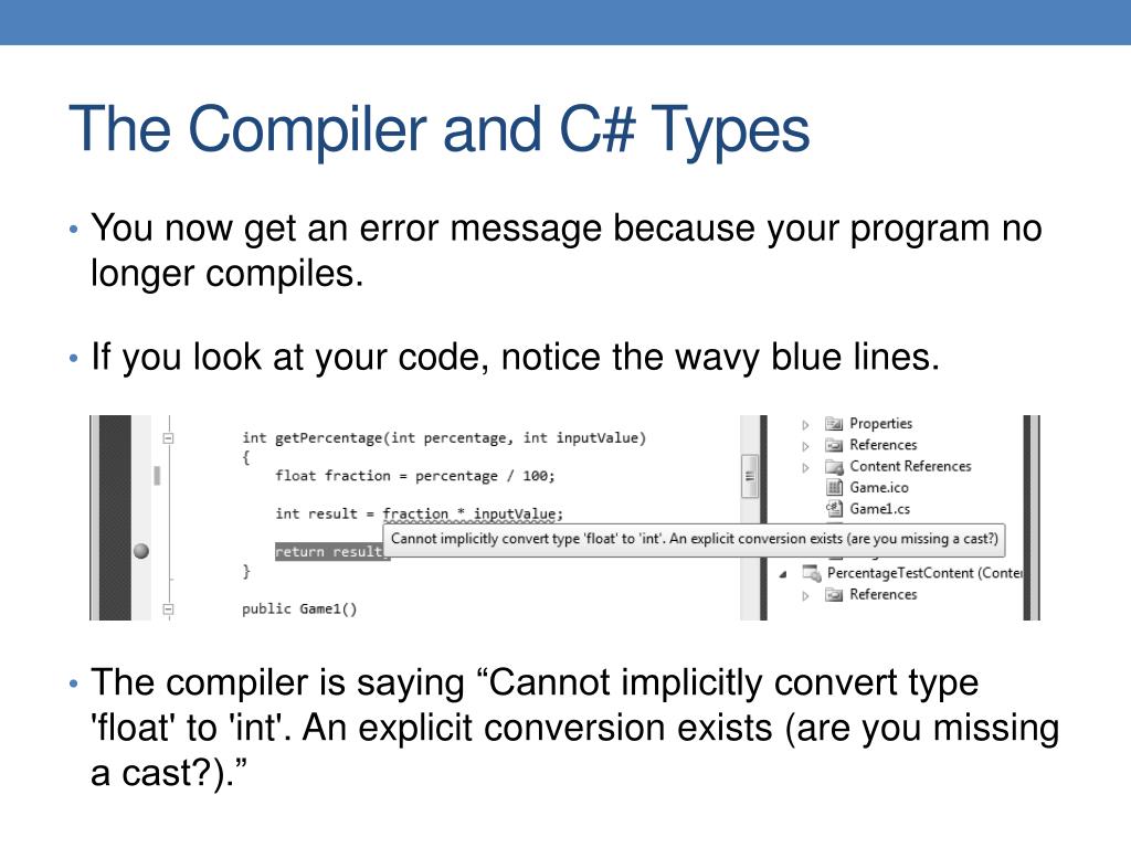The Compiler and C# Types • You now get an error message because your program no longer compiles. • If you look at your code, notice the wavy blue lines. • The compiler is saying “Cannot implicitly convert type 'float' to 'int'. An explicit conversion exists (are you missing a cast?).”