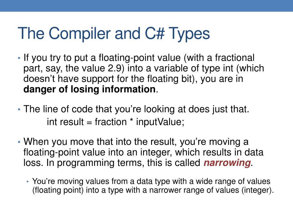 The Compiler and C# Types • If you try to put a floating-point value (with a fractional part, say, the value 2.9) into a variable of type int (which doesn’t have support for the floating bit), you are in danger of losing information. • The line of code that you’re looking at does just that. intresult = fraction * inputValue; • When you move that into the result, you’re moving a floating-point value into an integer, which results in data loss. In programming terms, this is called narrowing. • You’re moving values from a data type with a wide range of values (floating point) into a type with a narrower range of values (integer).