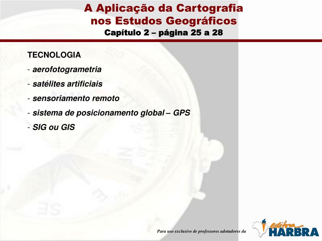 A Aplicação da Cartografianos Estudos Geográficos Capítulo 2 – página 25 a 28 • TECNOLOGIA • aerofotogrametria • satélites artificiais • sensoriamento remoto • sistema de posicionamento global – GPS • SIG ou GIS