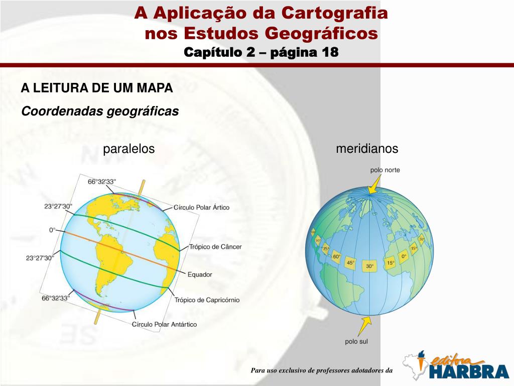 A Aplicação da Cartografianos Estudos Geográficos Capítulo 2 – página 17 A LEITURA DE UM MAPA Coordenadas geográficas plano equatorial