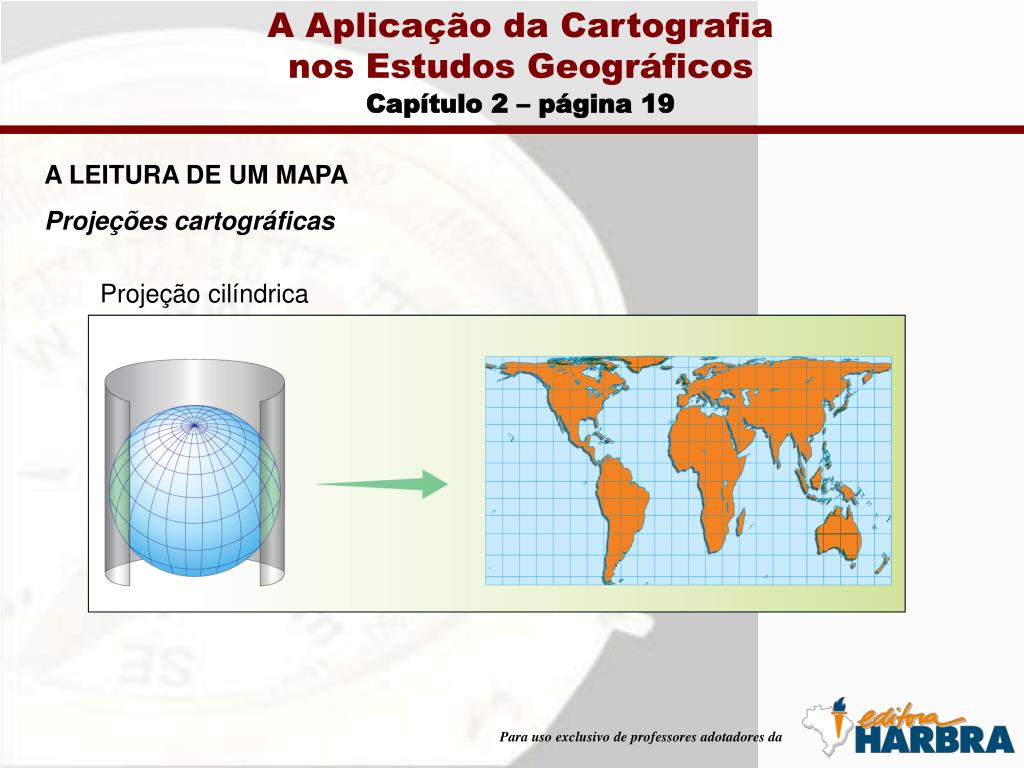 A Aplicação da Cartografianos Estudos Geográficos Capítulo 2 – página 19 A LEITURA DE UM MAPA Projeções cartográficas Projeção cilíndrica