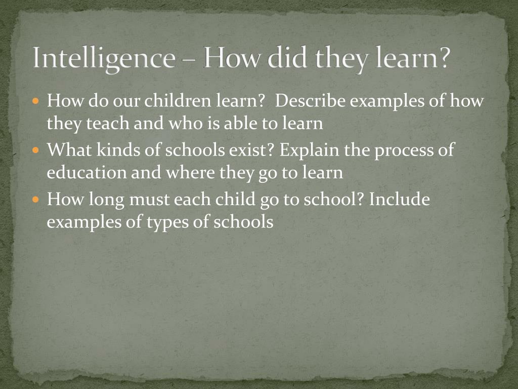 Intelligence – How did they learn? • How do our children learn? Describe examples of how they teach and who is able to learn • What kinds of schools exist? Explain the process of education and where they go to learn • How long must each child go to school? Include examples of types of schools
