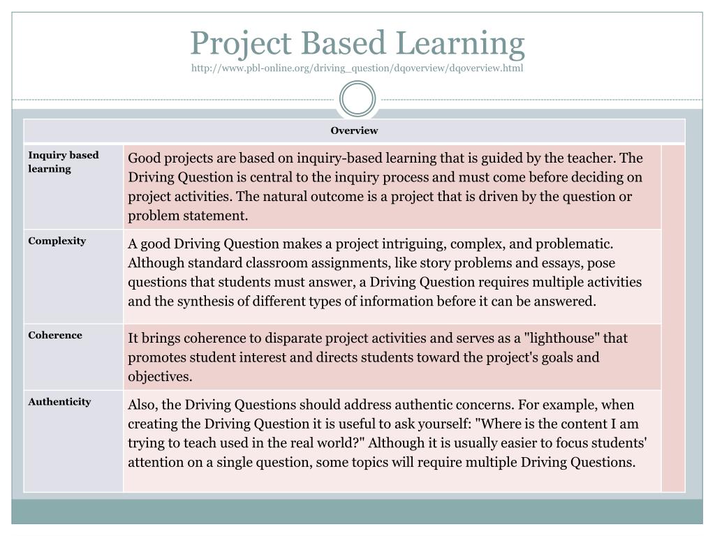 Project Based Learning http://www.pbl-online.org/driving_question/dqoverview/dqoverview.html