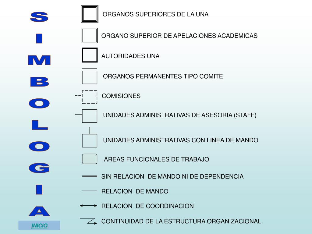 ORGANOS SUPERIORES DE LA UNA ORGANO SUPERIOR DE APELACIONES ACADEMICAS AUTORIDADES UNA ORGANOS PERMANENTES TIPO COMITE COMISIONES SIMBOLOGIA UNIDADES ADMINISTRATIVAS DE ASESORIA (STAFF) UNIDADES ADMINISTRATIVAS CON LINEA DE MANDO AREAS FUNCIONALES DE TRABAJO SIN RELACION DE MANDO NI DE DEPENDENCIA RELACION DE MANDO RELACION DE COORDINACION CONTINUIDAD DE LA ESTRUCTURA ORGANIZACIONAL INICIO