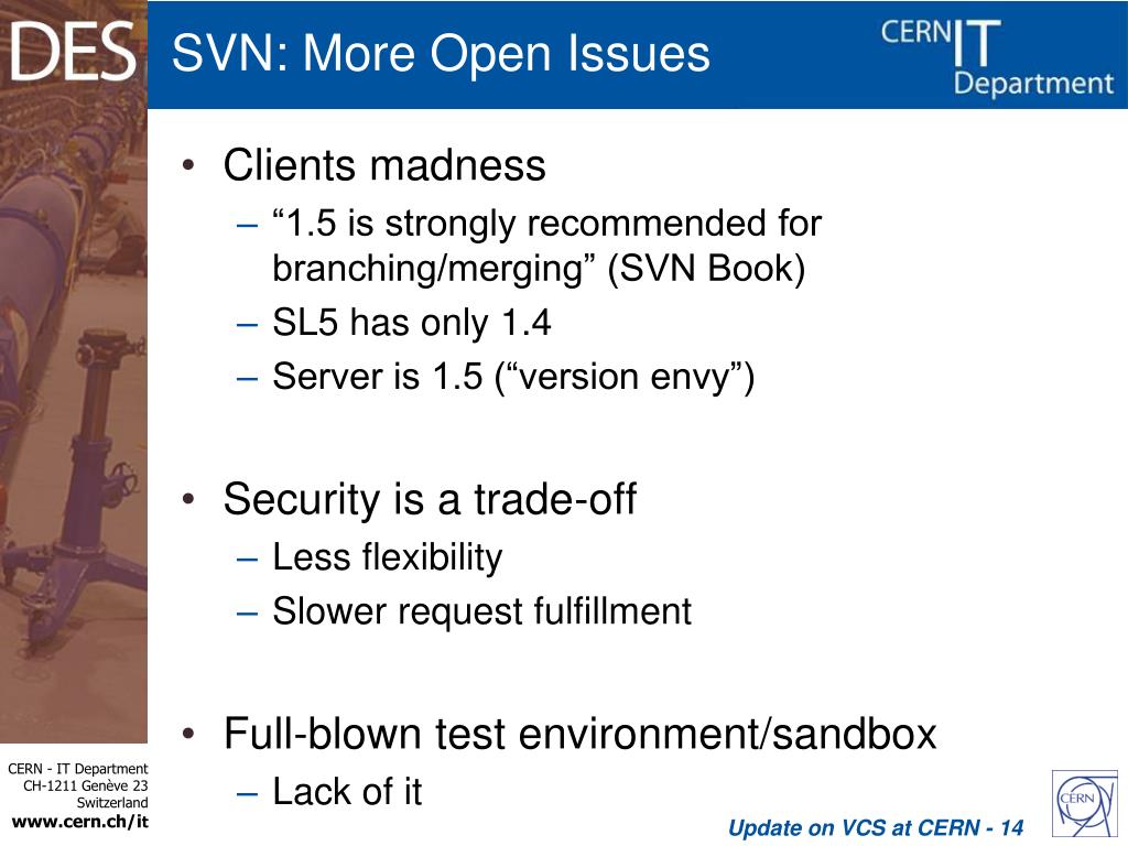 SVN: More Open Issues • Clients madness • “1.5 is strongly recommended for branching/merging” (SVN Book) • SL5 has only 1.4 • Server is 1.5 (“version envy”) • Security is a trade-off • Less flexibility • Slower request fulfillment • Full-blown test environment/sandbox • Lack of it Update on VCS at CERN - 14