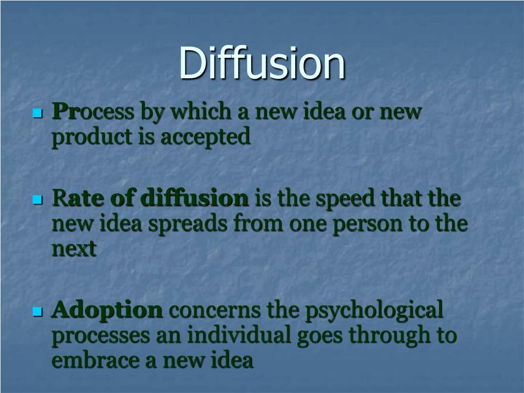 Diffusion Process. Four main elements. Diffusion. Pr ocess by which a new idea or new product is accepted R ate of diffusion is the speed that the new idea spreads from one person to the next Adoption concerns the psychological processes an individual goes through to embrace a new idea .