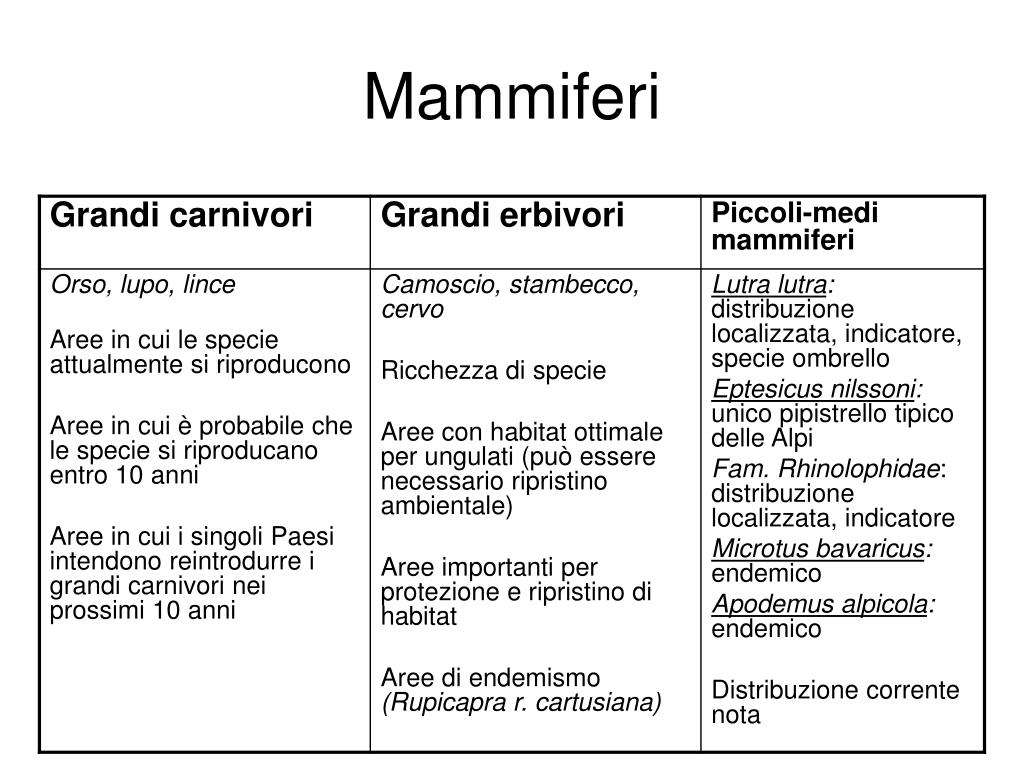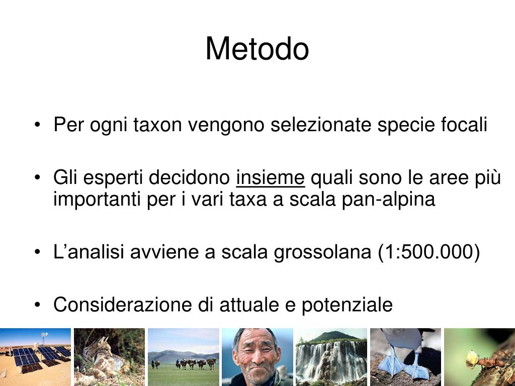 Metodo • Per ogni taxon vengono selezionate specie focali • Gli esperti decidono insieme quali sono le aree più importanti per i vari taxa a scala pan-alpina • L’analisi avviene a scala grossolana (1:500.000) • Considerazione di attuale e potenziale