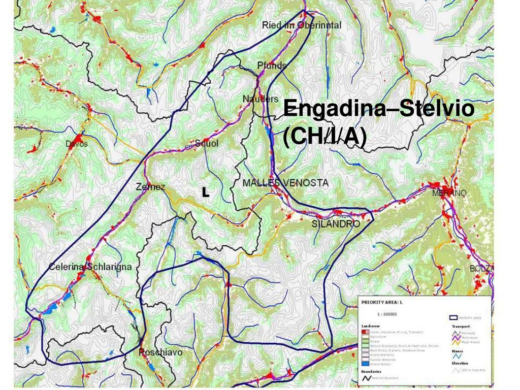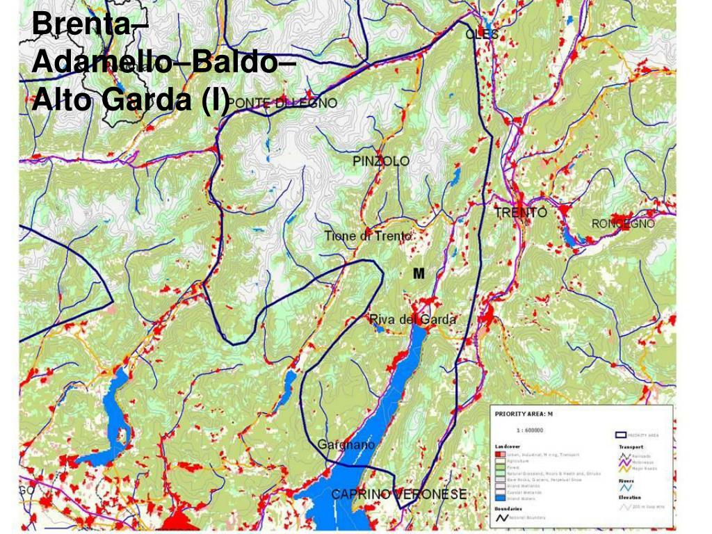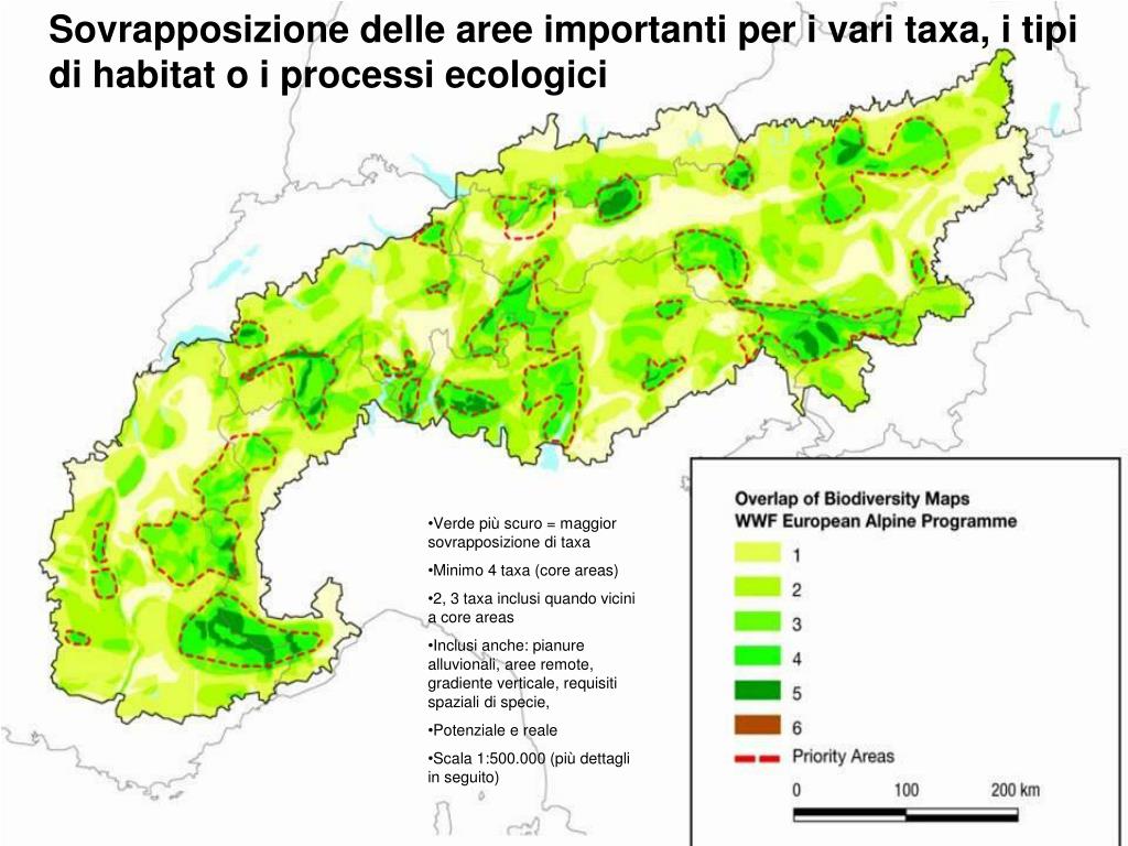 Sovrapposizione delle aree importanti per i vari taxa, i tipi di habitat o i processi ecologici • Verde più scuro = maggior sovrapposizione di taxa • Minimo 4 taxa (core areas) • 2, 3 taxa inclusi quando vicini a core areas • Inclusi anche: pianure alluvionali, aree remote, gradiente verticale, requisiti spaziali di specie, • Potenziale e reale • Scala 1:500.000 (più dettagli in seguito)