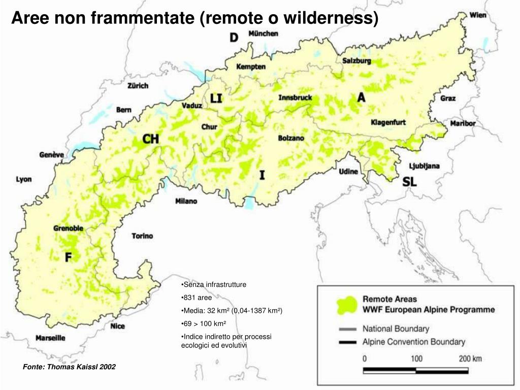 Aree non frammentate (remote o wilderness) • Senza infrastrutture • 831 aree • Media: 32 km² (0,04-1387 km²) • 69 > 100 km² • Indice indiretto per processi ecologici ed evolutivi Fonte: Thomas Kaissl 2002