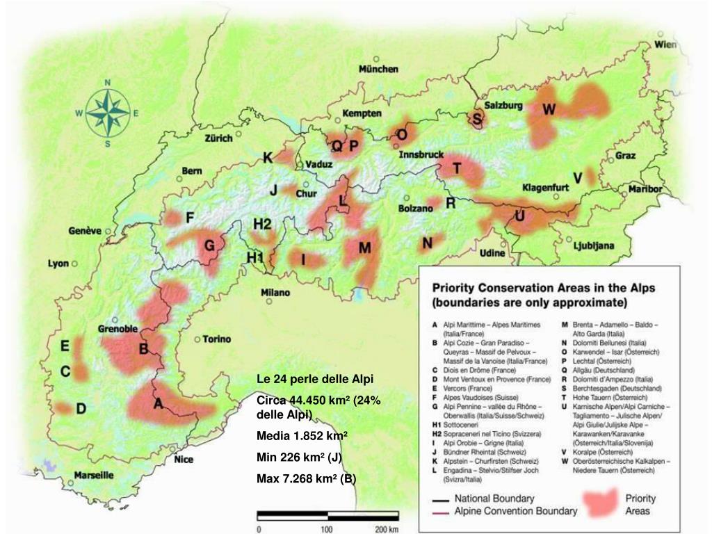 Le 24 perle delle Alpi Circa 44.450 km² (24% delle Alpi) Media 1.852 km² Min 226 km² (J) Max 7.268 km²(B)