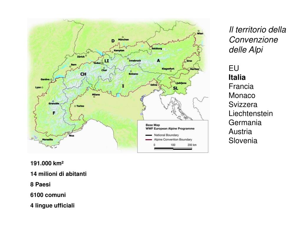 Il territorio della Convenzione delle Alpi • EU • Italia Francia Monaco Svizzera • Liechtenstein • Germania • Austria • Slovenia 191.000 km² 14 milioni di abitanti 8 Paesi 6100 comuni 4 lingue ufficiali