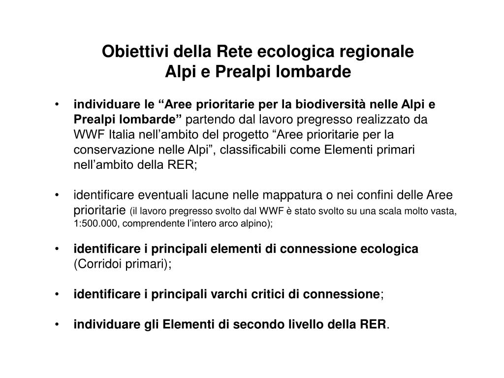 Obiettivi della Rete ecologica regionale • Alpi e Prealpi lombarde • individuare le “Aree prioritarie per la biodiversità nelle Alpi e Prealpi lombarde” partendo dal lavoro pregresso realizzato da WWF Italia nell’ambito del progetto “Aree prioritarie per la conservazione nelle Alpi”, classificabili come Elementi primari nell’ambito della RER; • identificare eventuali lacune nelle mappatura o nei confini delle Aree prioritarie (il lavoro pregresso svolto dal WWF è stato svolto su una scala molto vasta, 1:500.000, comprendente l’intero arco alpino); • identificare i principali elementi di connessione ecologica (Corridoi primari); • identificare i principali varchi critici di connessione; • individuare gli Elementi di secondo livello della RER.