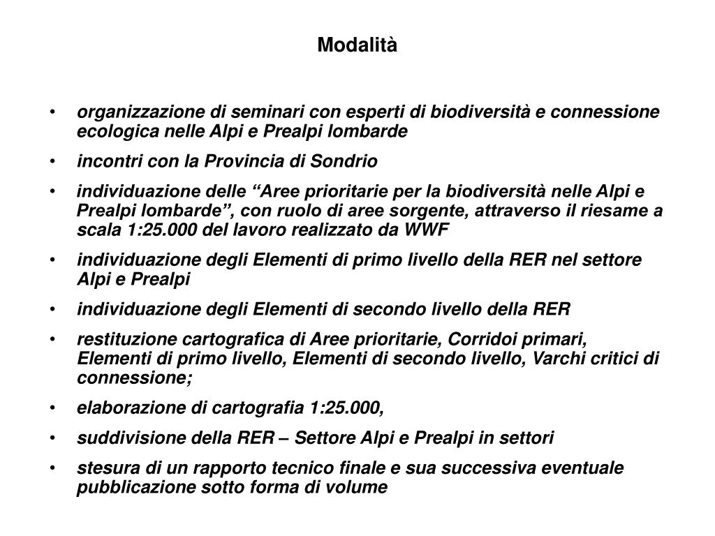 Modalità • organizzazione di seminari con esperti di biodiversità e connessione ecologica nelle Alpi e Prealpi lombarde • incontri con la Provincia di Sondrio • individuazione delle “Aree prioritarie per la biodiversità nelle Alpi e Prealpi lombarde”, con ruolo di aree sorgente, attraverso il riesame a scala 1:25.000 del lavoro realizzato da WWF • individuazione degli Elementi di primo livello della RER nel settore Alpi e Prealpi • individuazione degli Elementi di secondo livello della RER • restituzione cartografica di Aree prioritarie, Corridoi primari, Elementi di primo livello, Elementi di secondo livello, Varchi critici di connessione; • elaborazione di cartografia 1:25.000, • suddivisione della RER – Settore Alpi e Prealpi in settori • stesura di un rapporto tecnico finale e sua successiva eventuale pubblicazione sotto forma di volume