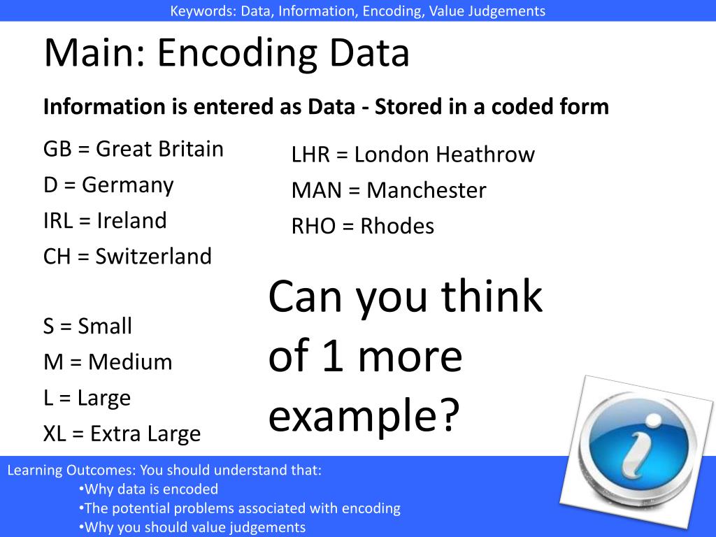 Main: Encoding Data Information is entered as Data - Stored in a coded form GB = Great Britain D = Germany IRL = Ireland CH = Switzerland LHR = London Heathrow MAN = Manchester RHO = Rhodes Can you think of 1 more example? S = Small M = Medium L = Large XL = Extra Large