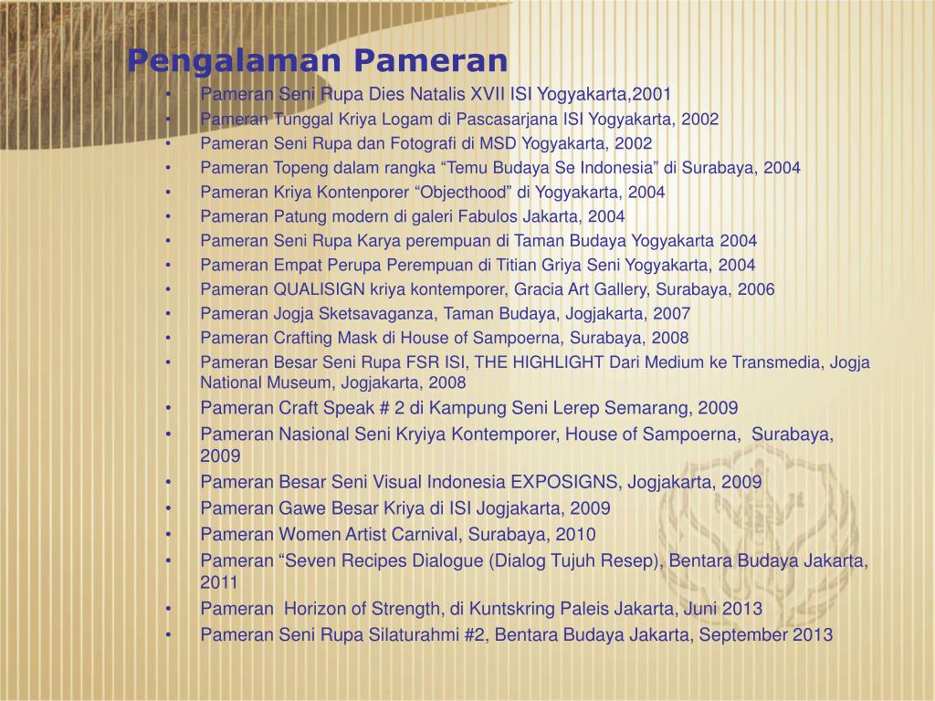 Pengalaman Pameran • Pameran Seni Rupa Dies Natalis XVII ISI Yogyakarta,2001 • Pameran Tunggal Kriya Logam di Pascasarjana ISI Yogyakarta, 2002 • Pameran Seni Rupa dan Fotografi di MSD Yogyakarta, 2002 • Pameran Topeng dalam rangka “Temu Budaya Se Indonesia” di Surabaya, 2004 • Pameran Kriya Kontenporer “Objecthood” di Yogyakarta, 2004 • Pameran Patung modern di galeri Fabulos Jakarta, 2004 • Pameran Seni Rupa Karya perempuan di Taman Budaya Yogyakarta 2004 • Pameran Empat Perupa Perempuan di Titian Griya Seni Yogyakarta, 2004 • Pameran QUALISIGN kriya kontemporer, Gracia Art Gallery, Surabaya, 2006 • Pameran Jogja Sketsavaganza, Taman Budaya, Jogjakarta, 2007 • Pameran Crafting Mask di House of Sampoerna, Surabaya, 2008 • Pameran Besar Seni Rupa FSR ISI, THE HIGHLIGHT Dari Medium ke Transmedia, Jogja National Museum, Jogjakarta, 2008 • Pameran Craft Speak # 2 di Kampung Seni Lerep Semarang, 2009 • Pameran Nasional Seni Kryiya Kontemporer, House of Sampoerna, Surabaya, 2009 • Pameran Besar Seni Visual Indonesia EXPOSIGNS, Jogjakarta, 2009 • Pameran Gawe Besar Kriya di ISI Jogjakarta, 2009 • Pameran Women Artist Carnival, Surabaya, 2010 • Pameran “Seven Recipes Dialogue (Dialog Tujuh Resep), Bentara Budaya Jakarta, 2011 • Pameran Horizon of Strength, di Kuntskring Paleis Jakarta, Juni 2013 • Pameran Seni Rupa Silaturahmi #2, Bentara Budaya Jakarta, September 2013