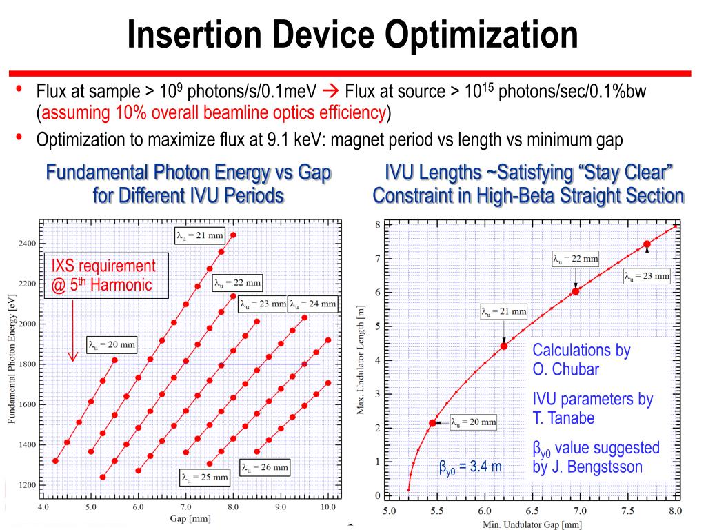 Insertion Device Optimization • Flux at sample > 109 photons/s/0.1meV Flux at source > 1015 photons/sec/0.1%bw(assuming 10% overall beamline optics efficiency) • Optimization to maximize flux at 9.1 keV: magnet period vs length vs minimum gap Fundamental Photon Energy vs Gapfor Different IVU Periods IVU Lengths ~Satisfying “Stay Clear” Constraint in High-Beta Straight Section IXS requirement @ 5th Harmonic Calculations by O. Chubar IVU parameters by T. Tanabe βy0 value suggested by J. Bengstsson βy0 = 3.4 m