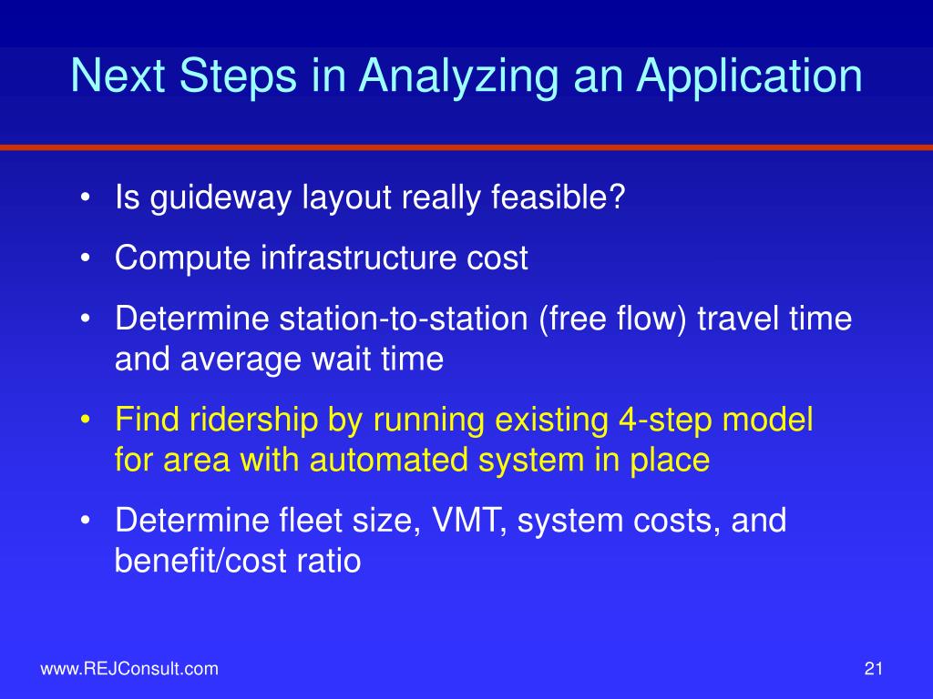 Next Steps in Analyzing an Application • Is guideway layout really feasible? • Compute infrastructure cost • Determine station-to-station (free flow) travel time and average wait time • Find ridership by running existing 4-step model for area with automated system in place • Determine fleet size, VMT, system costs, and benefit/cost ratio www.REJConsult.com