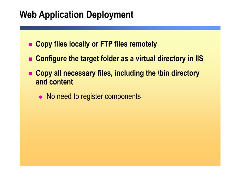 Web Application Deployment • Copy files locally or FTP files remotely • Configure the target folder as a virtual directory in IIS • Copy all necessary files, including the \bin directory and content • No need to register components