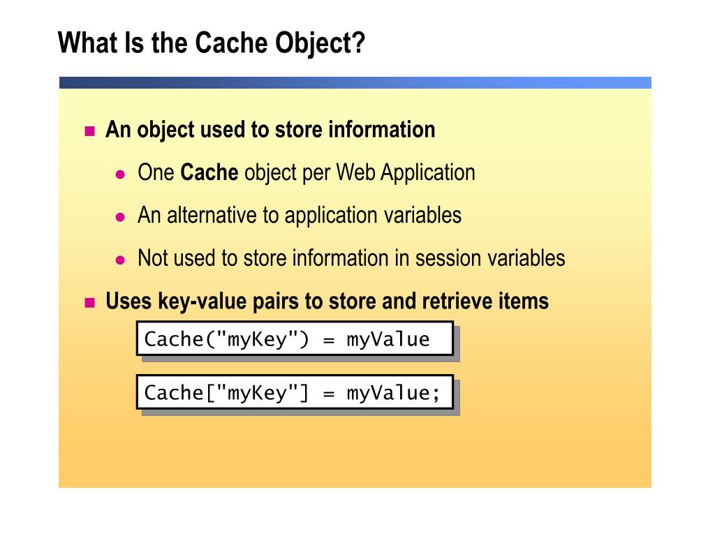 What Is the Cache Object? • An object used to store information • One Cache object per Web Application • An alternative to application variables • Not used to store information in session variables • Uses key-value pairs to store and retrieve items Cache("myKey") = myValue Cache["myKey"] = myValue;