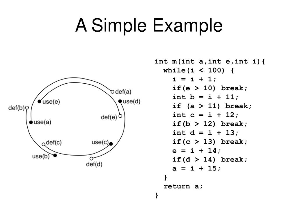 A Simple Example int m(int a,int e,int i){ while(i < 100) { i = i + 1; if(e > 10) break; int b = i + 11; if (a > 11) break; int c = i + 12; if(b > 12) break; int d = i + 13; if(c > 13) break; e = i + 14; if(d > 14) break; a = i + 15; } return a; }