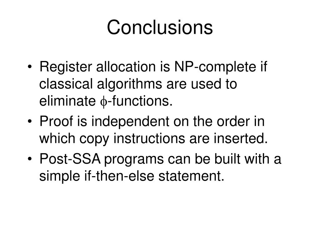 Conclusions • Register allocation is NP-complete if classical algorithms are used to eliminate -functions. • Proof is independent on the order in which copy instructions are inserted. • Post-SSA programs can be built with a simple if-then-else statement.