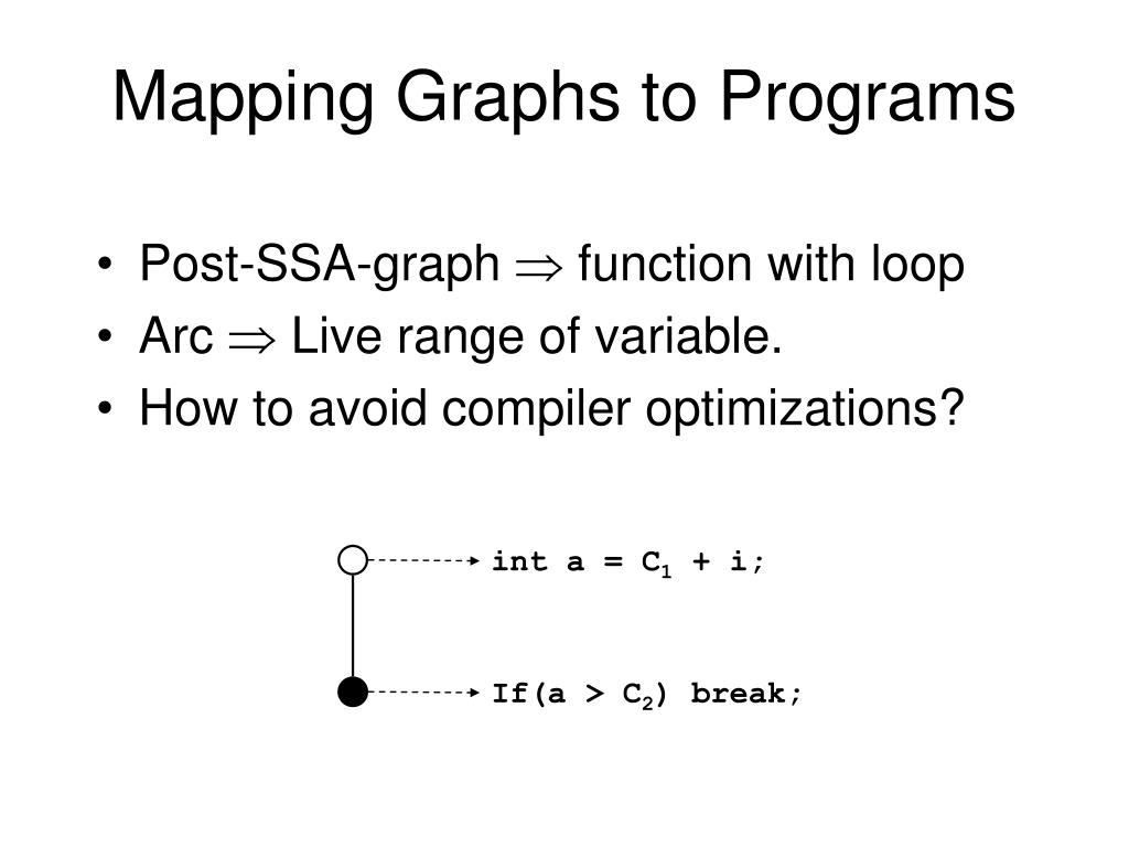 Mapping Graphs to Programs • Post-SSA-graph function with loop • Arc Live range of variable. • How to avoid compiler optimizations? int a = C1 + i; If(a > C2) break;