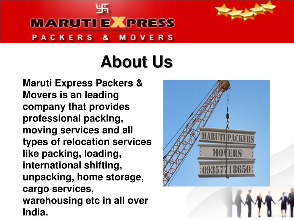 About Us Maruti Express Packers & Movers is an leading company that provides professional packing, moving services and all types of relocation services like packing, loading,international shifting, unpacking, home storage, cargo services, warehousing etc in all over India.