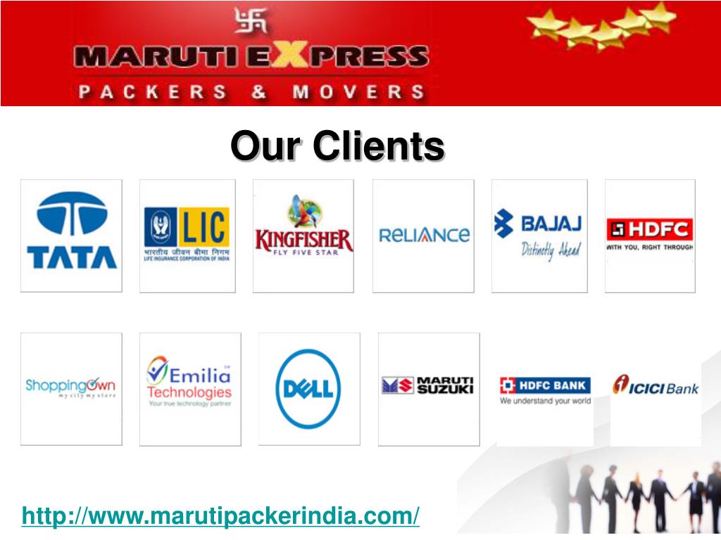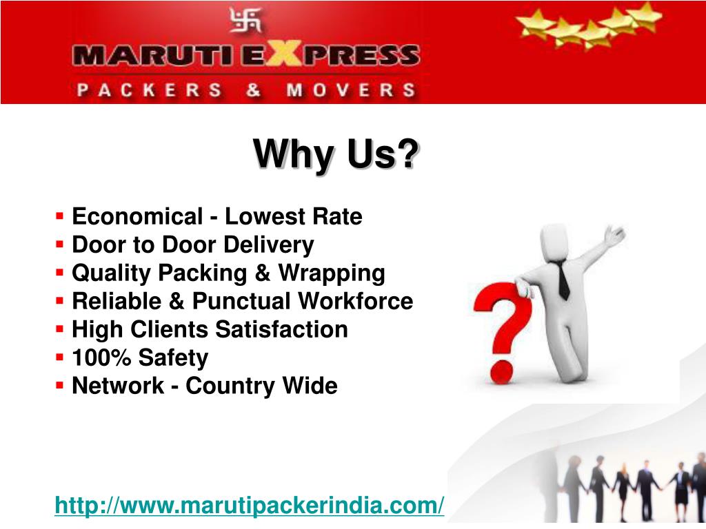 Why Us? • Economical - Lowest Rate • Door to Door Delivery • Quality Packing & Wrapping • Reliable&Punctual Workforce • High Clients Satisfaction • 100% Safety • Network - Country Wide http://www.marutipackerindia.com/