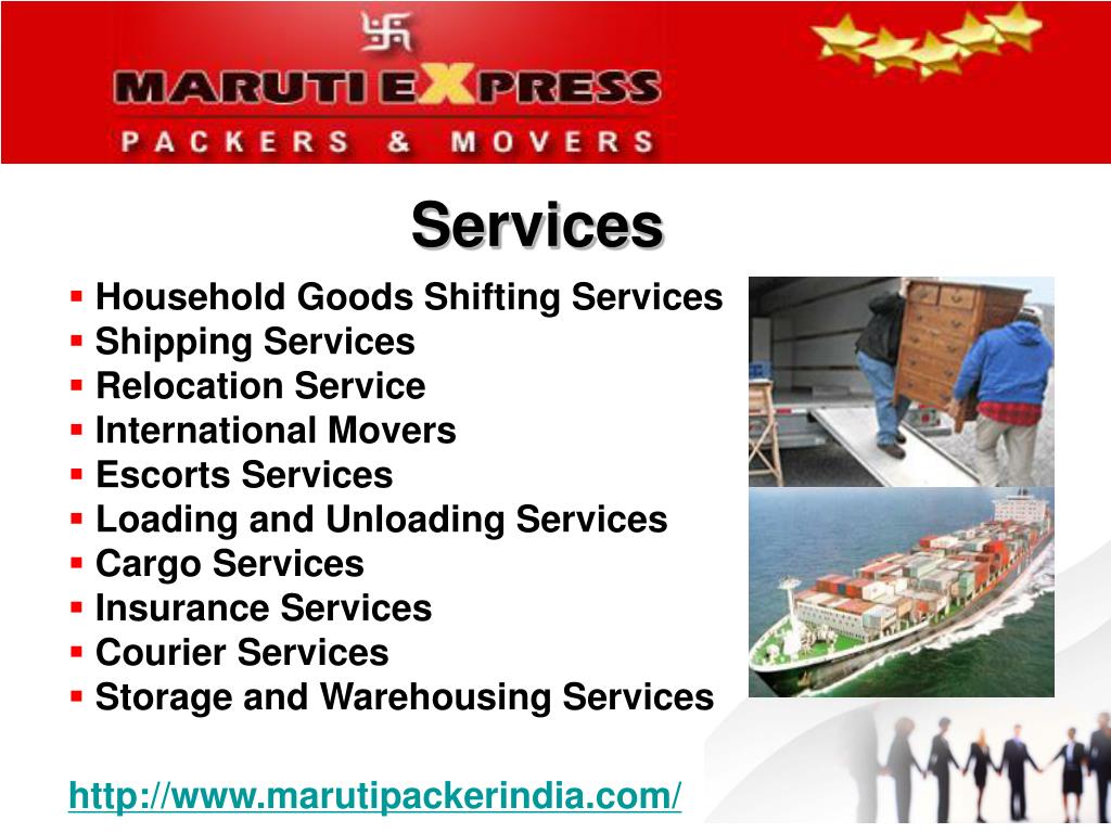 Services • Household Goods Shifting Services • Shipping Services • Relocation Service • International Movers • Escorts Services • Loading and Unloading Services • Cargo Services • Insurance Services • Courier Services • Storage and Warehousing Services http://www.marutipackerindia.com/