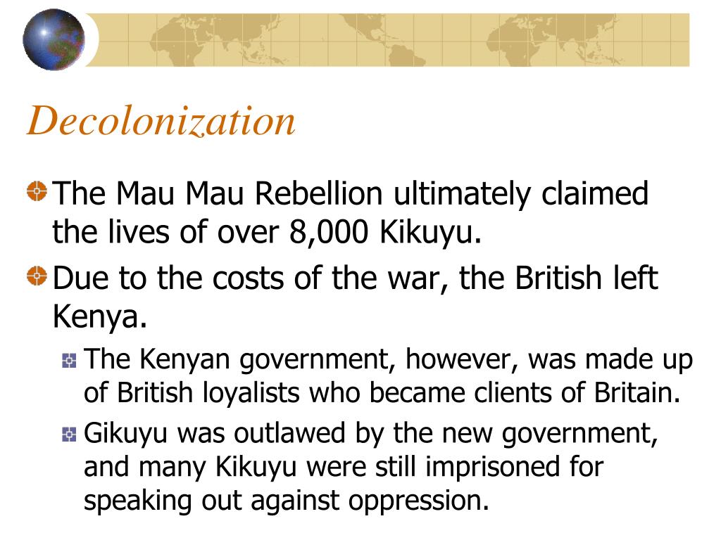 Decolonization • The Mau Mau Rebellion ultimately claimed the lives of over 8,000 Kikuyu. • Due to the costs of the war, the British left Kenya. • The Kenyan government, however, was made up of British loyalists who became clients of Britain. • Gikuyu was outlawed by the new government, and many Kikuyu were still imprisoned for speaking out against oppression.