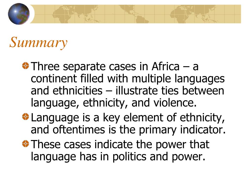 Summary • Three separate cases in Africa – a continent filled with multiple languages and ethnicities – illustrate ties between language, ethnicity, and violence. • Language is a key element of ethnicity, and oftentimes is the primary indicator. • These cases indicate the power that language has in politics and power.