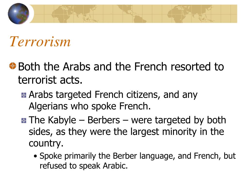 Terrorism • Both the Arabs and the French resorted to terrorist acts. • Arabs targeted French citizens, and any Algerians who spoke French. • The Kabyle – Berbers – were targeted by both sides, as they were the largest minority in the country. • Spoke primarily the Berber language, and French, but refused to speak Arabic.
