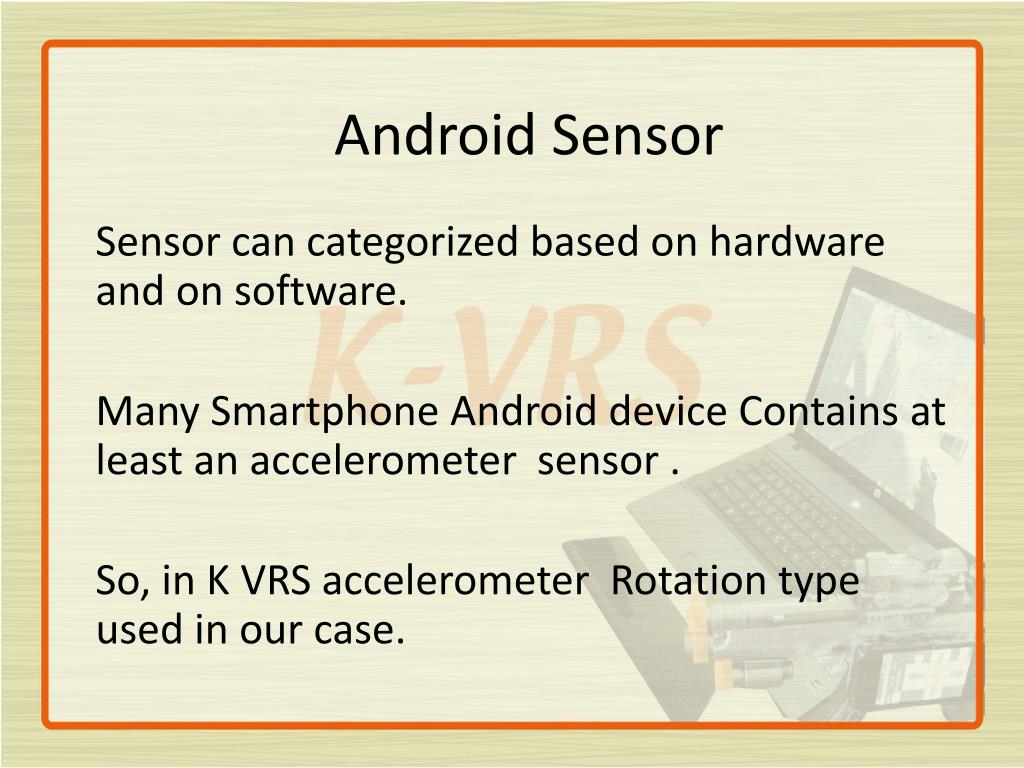 Android Sensor Sensor can categorized based on hardware and on software. Many Smartphone Android device Contains at least an accelerometer sensor . So, in K VRS accelerometer Rotation type used in our case.