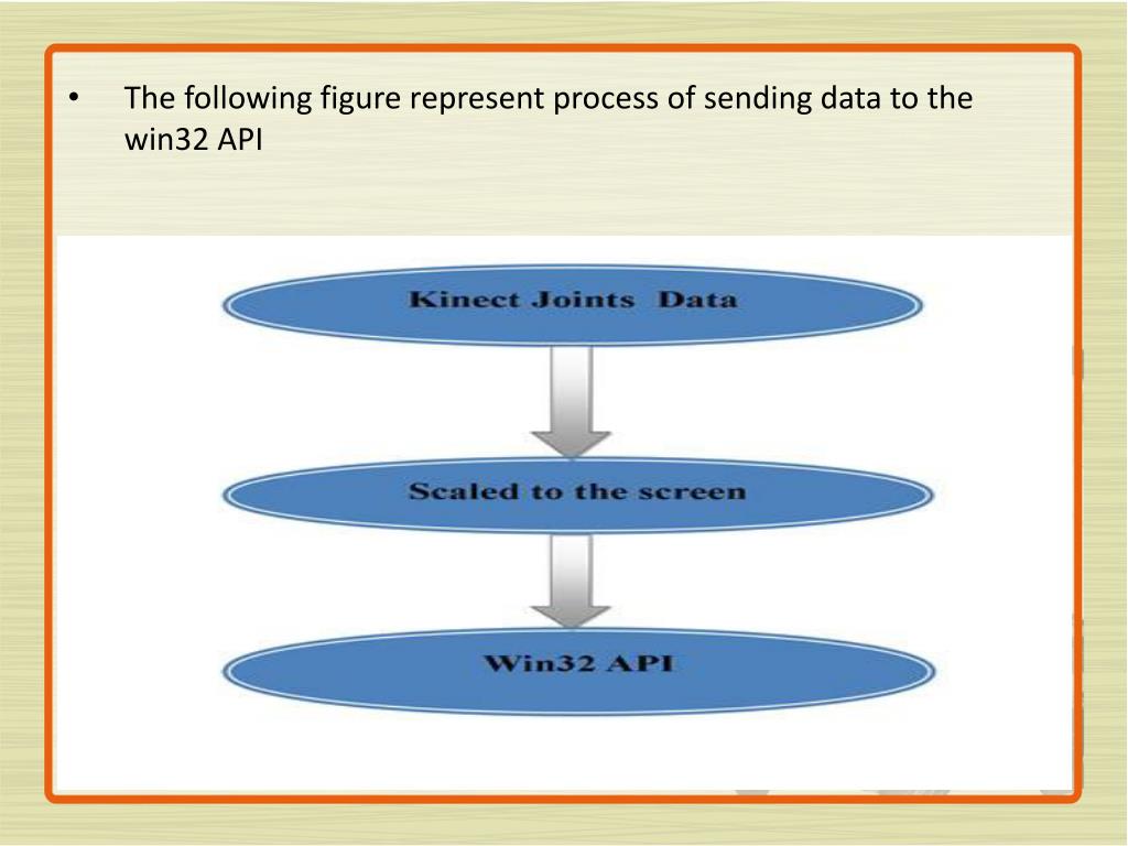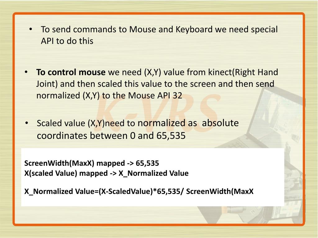 To control mouse we need (X,Y) value from kinect(Right Hand Joint) and then scaled this value to the screen and then send normalized (X,Y) to the Mouse API 32 Scaled value (X,Y)need to normalized as absolute coordinates between 0 and 65,535 To send commands to Mouse and Keyboard we need special API to do this ScreenWidth(MaxX) mapped -> 65,535 X(scaled Value) mapped -> X_Normalized Value X_NormalizedValue=(X-ScaledValue)*65,535/ ScreenWidth(MaxX