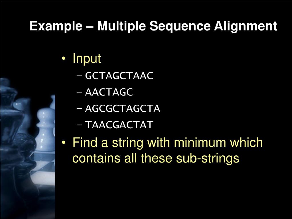 Example – Multiple Sequence Alignment • Input • GCTAGCTAAC • AACTAGC • AGCGCTAGCTA • TAACGACTAT • Find a string with minimum which contains all these sub-strings