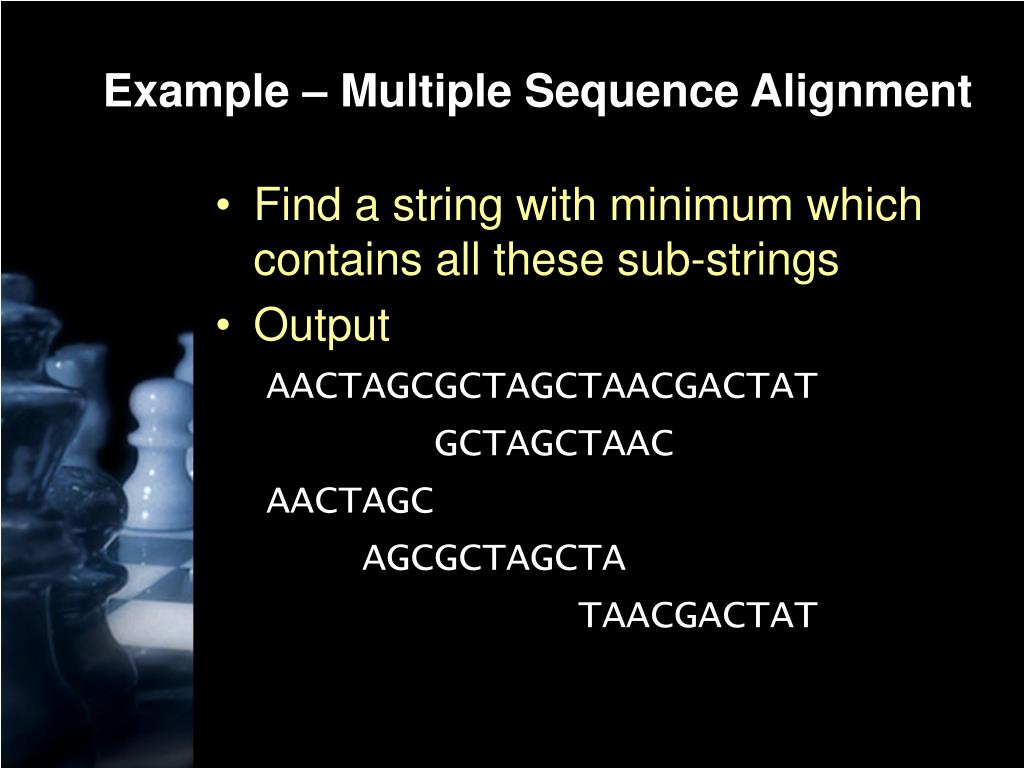 Example – Multiple Sequence Alignment • Find a string with minimum which contains all these sub-strings • Output AACTAGCGCTAGCTAACGACTAT GCTAGCTAAC AACTAGC AGCGCTAGCTA TAACGACTAT