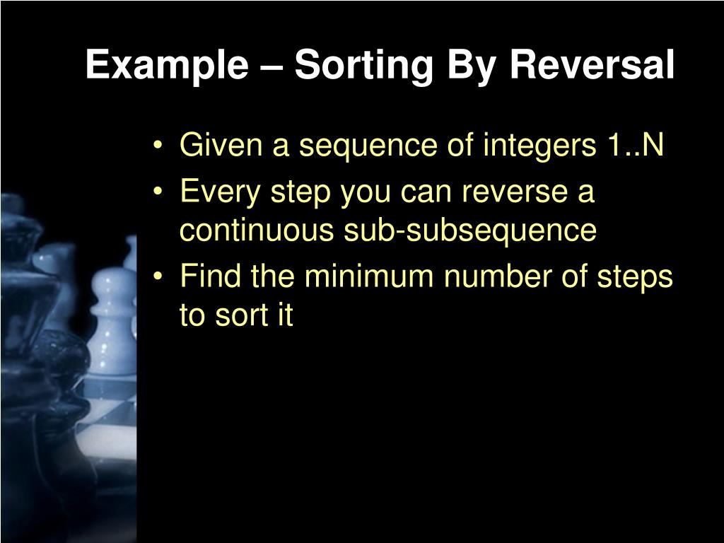 Example – Sorting By Reversal • Given a sequence of integers 1..N • Every step you can reverse a continuous sub-subsequence • Find the minimum number of steps to sort it