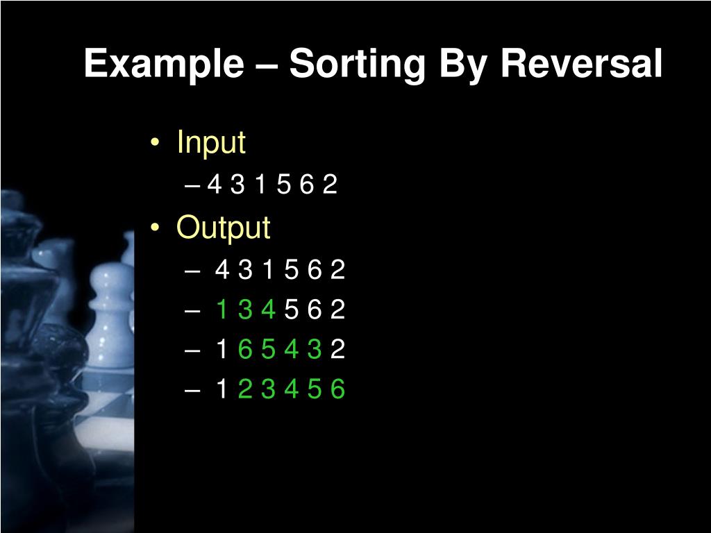 Example – Sorting By Reversal • Input • 4 3 1 5 6 2 • Output • 4 3 1 5 6 2 • 1 3 4 5 6 2 • 1 6 5 4 3 2 • 1 2 3 4 5 6