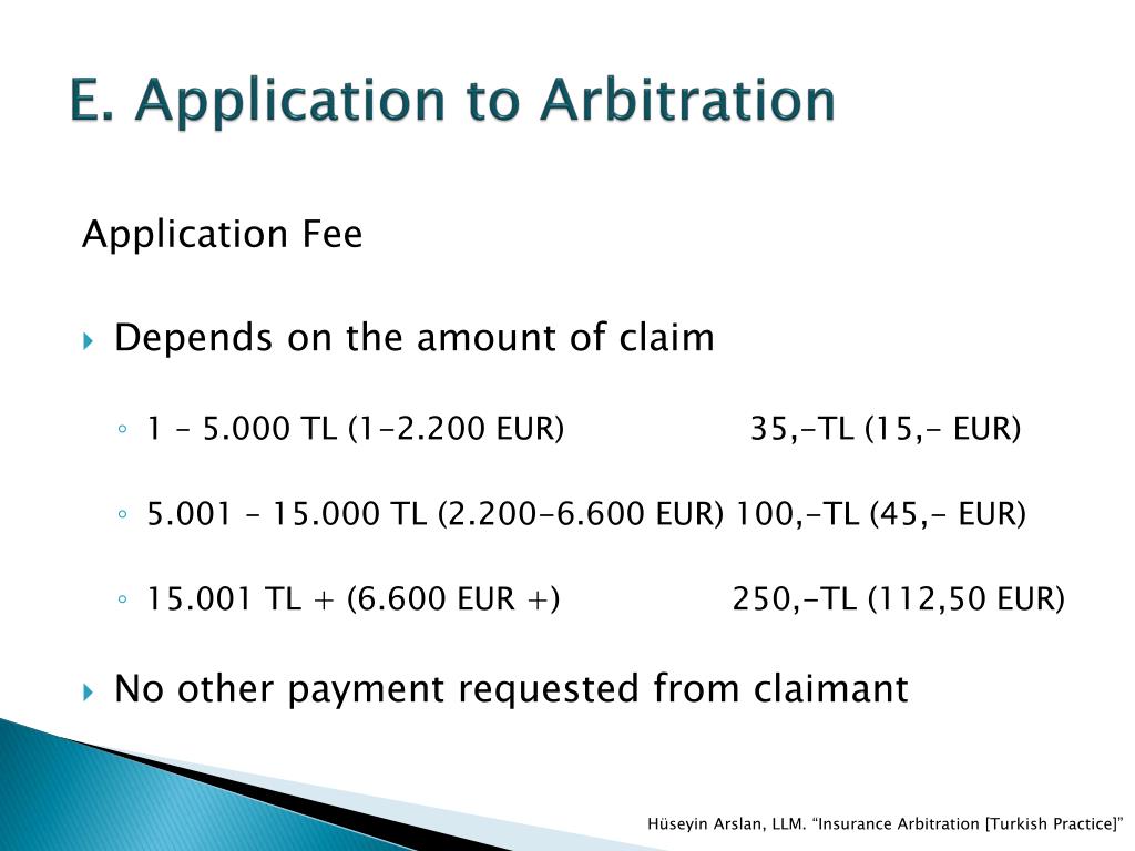 E. Application to Arbitration Application Fee • Depends on the amount of claim • 1 – 5.000 TL (1-2.200 EUR) 35,-TL (15,- EUR) • 5.001 – 15.000 TL (2.200-6.600 EUR) 100,-TL (45,- EUR) • 15.001 TL + (6.600 EUR +) 250,-TL (112,50 EUR) • No other payment requested from claimant Hüseyin Arslan, LLM. “Insurance Arbitration [Turkish Practice]”