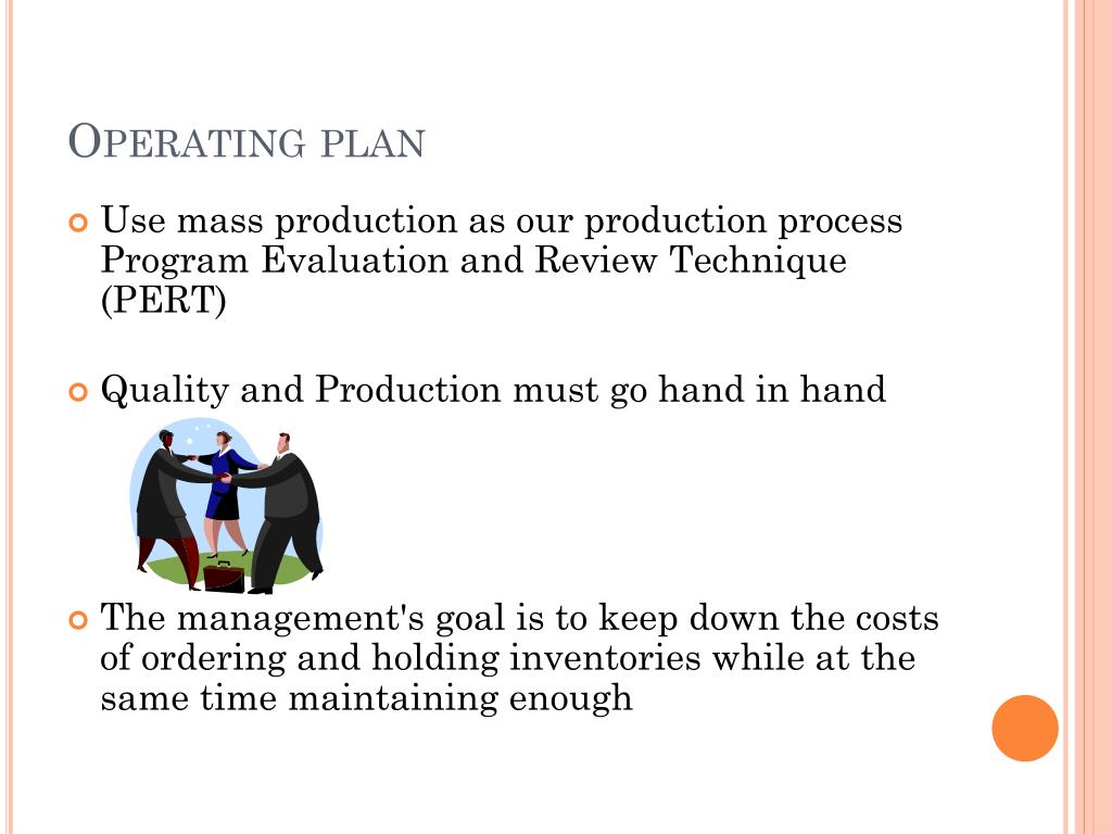 Operating plan • Use mass production as our production processProgram Evaluation and Review Technique (PERT) • Quality and Production must go hand in hand • The management's goal is to keep down the costs of ordering and holding inventories while at the same time maintaining enough