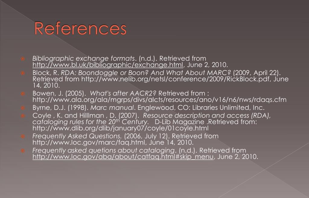 References • Bibliographic exchange formats. (n.d.). Retrieved from http://www.bl.uk/bibliographic/exchange.html, June 2, 2010. • Block, R. RDA: Boondoggle or Boon? And What About MARC? (2009, April 22). Retrieved from http://www.nelib.org/netsl/conference/2009/RickBlock.pdf, June 14, 2010. • Bowen, J. (2005). What's after AACR2? Retrieved from : http://www.ala.org/ala/mgrps/divs/alcts/resources/ano/v16/n6/nws/rdaqs.cfm • Byrne, D.J. (1998). Marc manual. Englewood, CO: Libraries Unlimited, Inc. • Coyle , K. and Hilllman , D. (2007). Resource description and access (RDA), cataloging rules for the 20th Century. D-Lib Magazine .Retrieved from: http://www.dlib.org/dlib/january07/coyle/01coyle.html • Frequently Asked Questions. (2006, July 12). Retrieved from http://www.loc.gov/marc/faq.html, June 14, 2010. • Frequently asked quetions about cataloging. (n.d.). Retrieved from http://www.loc.gov/aba/about/catfaq.html#skip_menu, June 2, 2010.