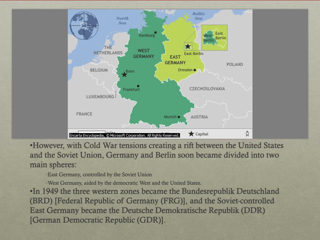 However, with Cold War tensions creating a rift between the United States and the Soviet Union, Germany and Berlin soon became divided into two main spheres: East Germany, controlled by the Soviet Union West Germany, aided by the democratic West and the United States. In 1949 the three western zones became the Bundesrepublik Deutschland (BRD) [Federal Republic of Germany (FRG)], and the Soviet-controlled East Germany became the Deutsche DemokratischeRepublik (DDR) [German Democratic Republic (GDR)].