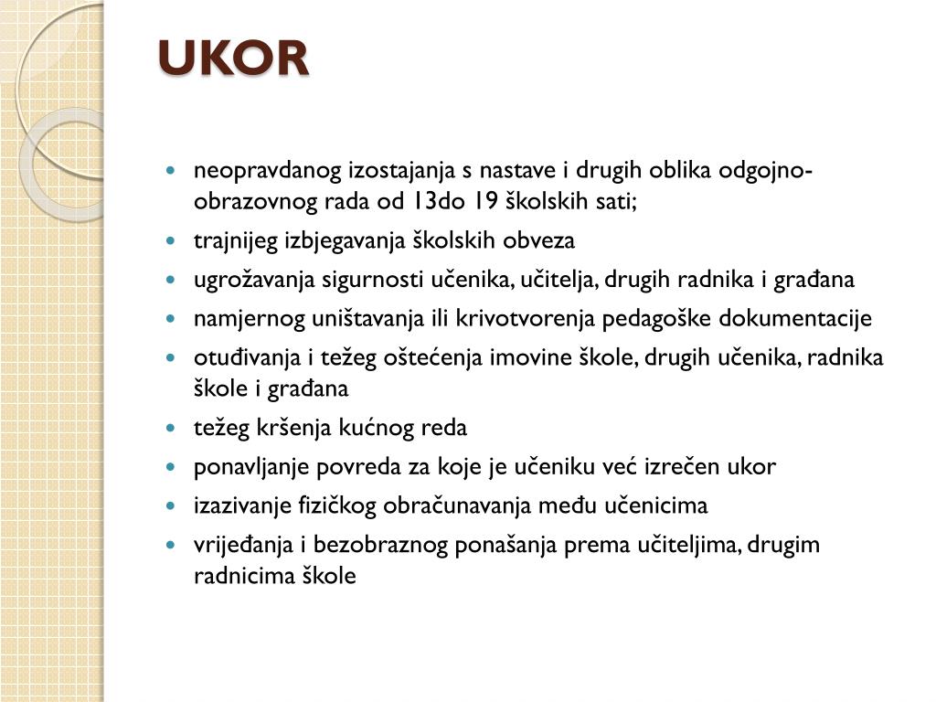 UKOR • neopravdanog izostajanja s nastave i drugih oblika odgojno-obrazovnog rada od 13do 19 školskih sati; • trajnijeg izbjegavanja školskih obveza • ugrožavanja sigurnosti učenika, učitelja, drugih radnika i građana • namjernog uništavanja ili krivotvorenja pedagoške dokumentacije • otuđivanja i težeg oštećenja imovine škole, drugih učenika, radnika škole i građana • težeg kršenja kućnog reda • ponavljanje povreda za koje je učeniku već izrečen ukor • izazivanje fizičkog obračunavanja među učenicima • vrijeđanja i bezobraznog ponašanja prema učiteljima, drugim radnicima škole