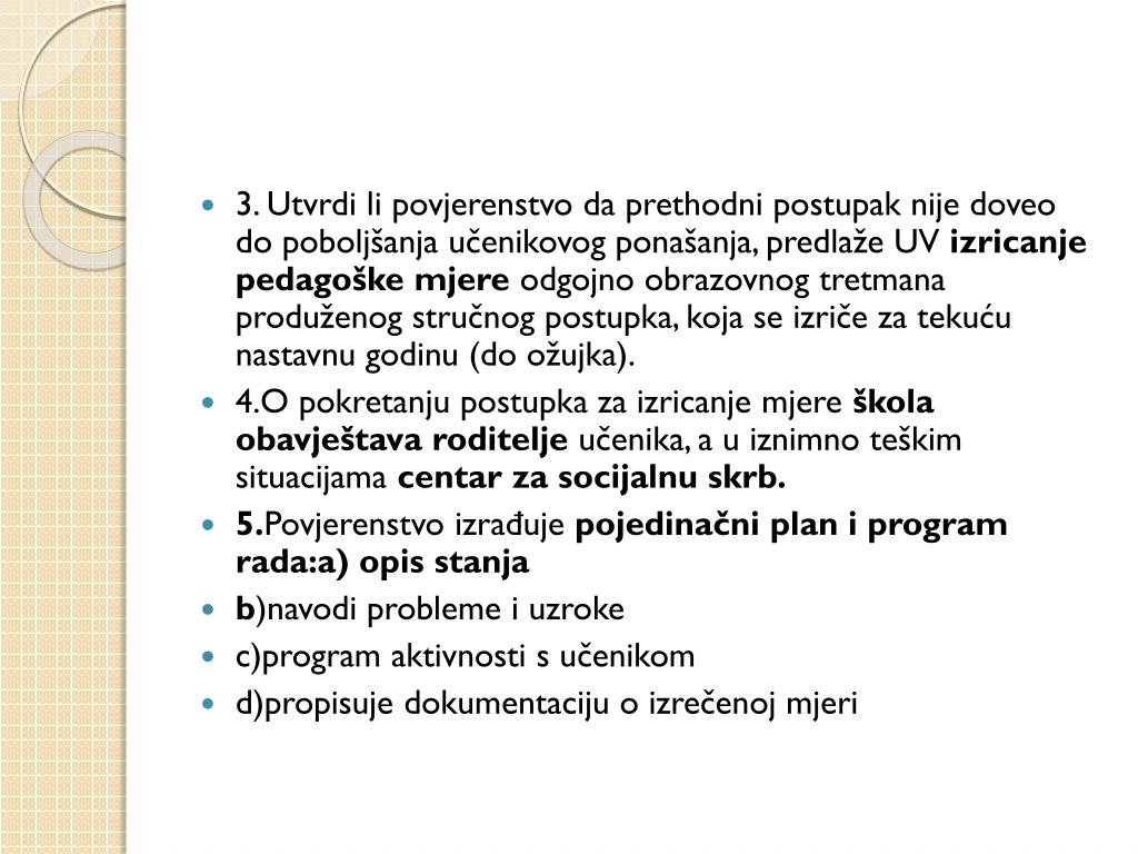 3. Utvrdi li povjerenstvo da prethodni postupak nije doveo do poboljšanja učenikovog ponašanja, predlaže UV izricanje pedagoške mjere odgojno obrazovnog tretmana produženog stručnog postupka, koja se izriče za tekuću nastavnu godinu (do ožujka). • 4.O pokretanju postupka za izricanje mjere škola obavještava roditelje učenika, a u iznimno teškim situacijama centar za socijalnu skrb. • 5.Povjerenstvo izrađuje pojedinačni plan i program rada:a) opis stanja • b)navodi probleme i uzroke • c)program aktivnosti s učenikom • d)propisuje dokumentaciju o izrečenoj mjeri