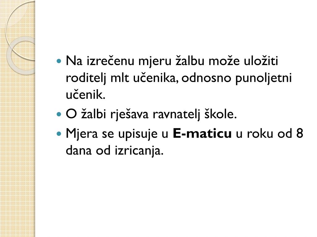 Na izrečenu mjeru žalbu može uložiti roditelj mlt učenika, odnosno punoljetni učenik. • O žalbi rješava ravnatelj škole. • Mjera se upisuje u E-maticu u roku od 8 dana od izricanja.