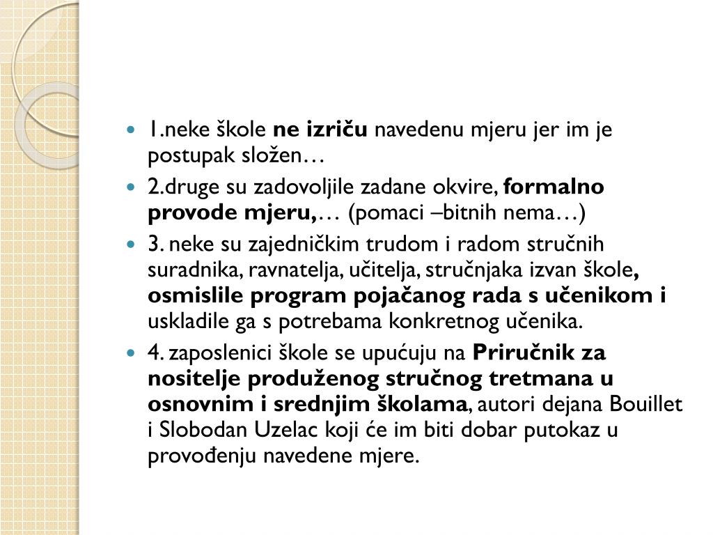 1.neke škole ne izriču navedenu mjeru jer im je postupak složen… • 2.druge su zadovoljile zadane okvire, formalno provode mjeru,… (pomaci –bitnih nema…) • 3. neke su zajedničkim trudom i radom stručnih suradnika, ravnatelja, učitelja, stručnjaka izvan škole, osmislile program pojačanog rada s učenikom i uskladile ga s potrebama konkretnog učenika. • 4. zaposlenici škole se upućuju na Priručnik za nositelje produženog stručnog tretmana uosnovnim i srednjim školama, autori dejana Bouillet i Slobodan Uzelac koji će im biti dobar putokaz u provođenju navedene mjere.