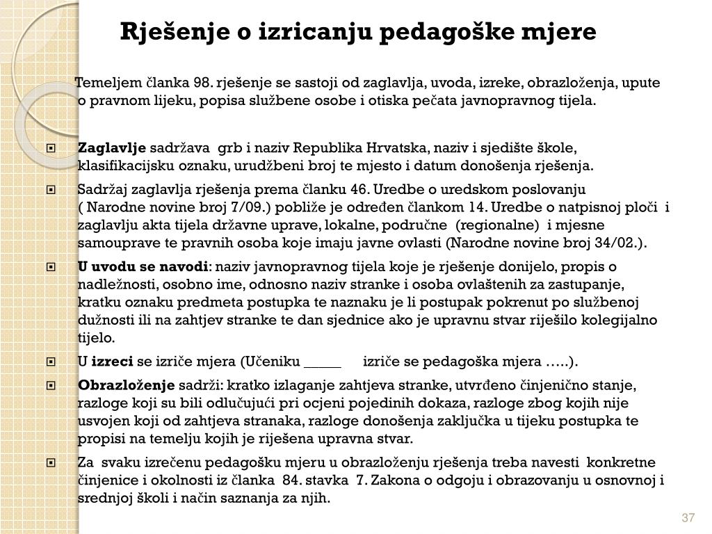 Rješenje o izricanju pedagoške mjere Temeljem članka 98. rješenje se sastoji odzaglavlja, uvoda, izreke, obrazloženja, upute o pravnom lijeku, popisa službene osobe i otiska pečata javnopravnog tijela. • Zaglavlje sadržava grb i naziv Republika Hrvatska, naziv i sjedište škole, klasifikacijsku oznaku, urudžbeni broj te mjesto i datum donošenja rješenja. • Sadržaj zaglavlja rješenja prema članku 46. Uredbe o uredskom poslovanju ( Narodne novine broj 7/09.) pobliže je određen člankom 14. Uredbe o natpisnoj ploči i zaglavlju akta tijela državne uprave, lokalne, područne (regionalne) i mjesne samouprave te pravnih osoba koje imaju javne ovlasti (Narodne novine broj 34/02.). • U uvodu se navodi: naziv javnopravnog tijela koje je rješenje donijelo, propis o nadležnosti, osobno ime, odnosno naziv stranke i osoba ovlaštenih za zastupanje, kratku oznaku predmeta postupka te naznaku je li postupak pokrenut po službenoj dužnosti ili na zahtjev stranke te dan sjednice ako je upravnu stvar riješilo kolegijalno tijelo. • U izreci se izriče mjera (Učeniku _____ izriče se pedagoška mjera …..). • Obrazloženje sadrži: kratko izlaganje zahtjeva stranke, utvrđeno činjenično stanje, razloge koji su bili odlučujući pri ocjeni pojedinih dokaza, razloge zbog kojih nije usvojen koji od zahtjeva stranaka, razloge donošenja zaključka u tijeku postupka te propisi na temelju kojih je riješena upravna stvar. • Za svaku izrečenu pedagošku mjeru u obrazloženju rješenja treba navesti konkretne činjenice i okolnosti iz članka 84. stavka 7. Zakona o odgoju i obrazovanju u osnovnoj i srednjoj školi i način saznanja za njih.