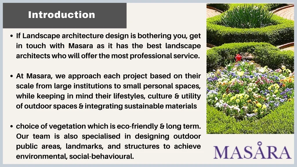 Introduction If Landscape architecture design is bothering you, get in touch with Masara as it has the best landscape architects who will offer the most professional service. At Masara, we approach each project based on their scale from large institutions to small personal spaces, while keeping in mind their lifestyles, culture & utility of outdoor spaces & integrating sustainable materials choice of vegetation which is eco-friendly & long term. Our team is also specialised in designing outdoor public areas, landmarks, and structures to achieve environmental, social-behavioural.