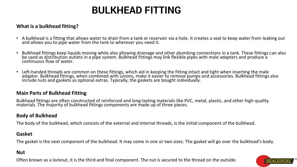 A bulkhead is a fitting that allows water to drain from a tank or reservoir via a hole. It creates a seal to keep water from leaking out and allows you to pipe water from the tank to wherever you need it.<br><br>https://www.slideshare.net/SakshatPuro1/top-notch-stainless-steel-bulkhead-fitting<br><br>stainless steel bulkhead fitting, bulkhead fitting<br><br>