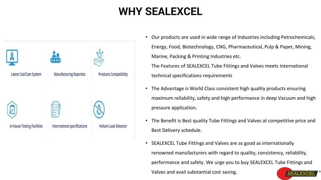 WHY SEALEXCEL • Our products are used in wide range of Industries including Petrochemicals, Energy, Food, Biotechnology, CNG, Pharmaceutical, Pulp & Paper, Mining, Marine, Packing & Printing Industries etc.The Features of SEALEXCEL Tube Fittings and Valves meets International technical specifications requirements • The Advantage is World Class consistent high quality products ensuring maximum reliability, safety and high performance in deep Vacuum and high pressure application. • The Benefit is Best quality Tube Fittings and Valves at competitive price and Best Delivery schedule. • SEALEXCEL Tube Fittings and Valves are as good as internationally renowned manufacturers with regard to quality, consistency, reliability, performance and safety. We urge you to buy SEALEXCEL Tube Fittings and Valves and avail substantial cost saving.